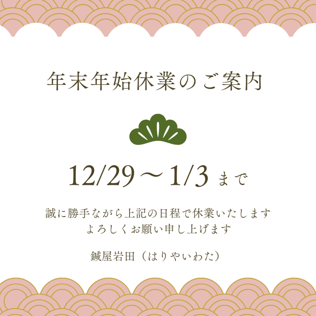 年末年始休業のご案内*Instagram 2024年12月27日2024年12月27日NICHIJYO PHOTO、はりやいわた、診療日カレンダー 年末年始は12月29日(日)〜1月3日(金)までお休みをいたします。ご不便をおかけしますが、よろしくお願いいたします。 共有: Facebook で共有するにはクリックしてください (新しいウィンドウで開きます) Facebook クリックして X で共有 (新しいウィンドウで開きます) X 関連