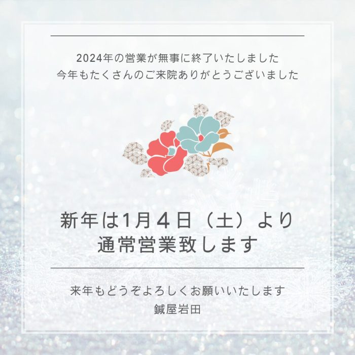 今年もありがとうございました*Instagram 2024年12月28日2024年12月28日NICHIJYO PHOTO、はりやいわた、診療日カレンダー 2024年の営業が無事に終了いたしました。本年もたくさんご来院いただきまして誠にありがとうございました。 来年も変わらず頑張っていきたいと思います。どうぞよろしくお願いいたします! 鍼屋岩田(はりやいわた) 共有: Facebook で共有するにはクリックしてください (新しいウィンドウで開きます) Facebook クリックして X で共有 (新しいウィンドウで開きます) X 関連