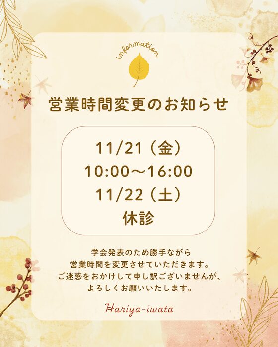 学会発表に伴う営業時間変更のお知らせ 2025年11月5日2025年11月7日はりやいわた、診療日カレンダー 2025年11月22日(土)―23日(日・祝)に開催される第33回日本鍼灸史学会学術大会にて発表するため、下記の通り営業時間を変更いたします。 11月21日(金):10時〜16時のみ営業 11月22日(土):休診 ご迷惑をおかけして申し訳ありませんが、よろしくお願いいたします。 日本鍼灸史学会THE JAPAN SOCIETY OF ACUPUNCTURE & MOXIBUSTION HISTORYjsamh.org 共有: Facebook で共有するにはクリックしてください (新しいウィンドウで開きます) Facebook クリックして X で共有 (新しいウィンドウで開きます) X 関連